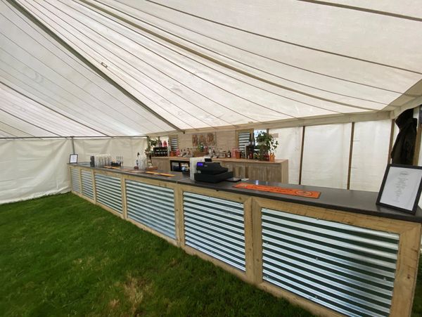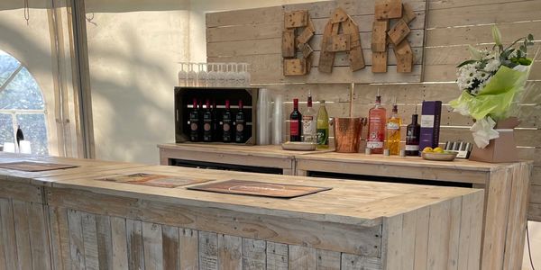 This rustic set up is ideal for indoor spaces such as marquees and halls. With a chic white wash finish, this bar looks quite the part at any party. Built in sections, it can be adapted to different settings and spaces.
